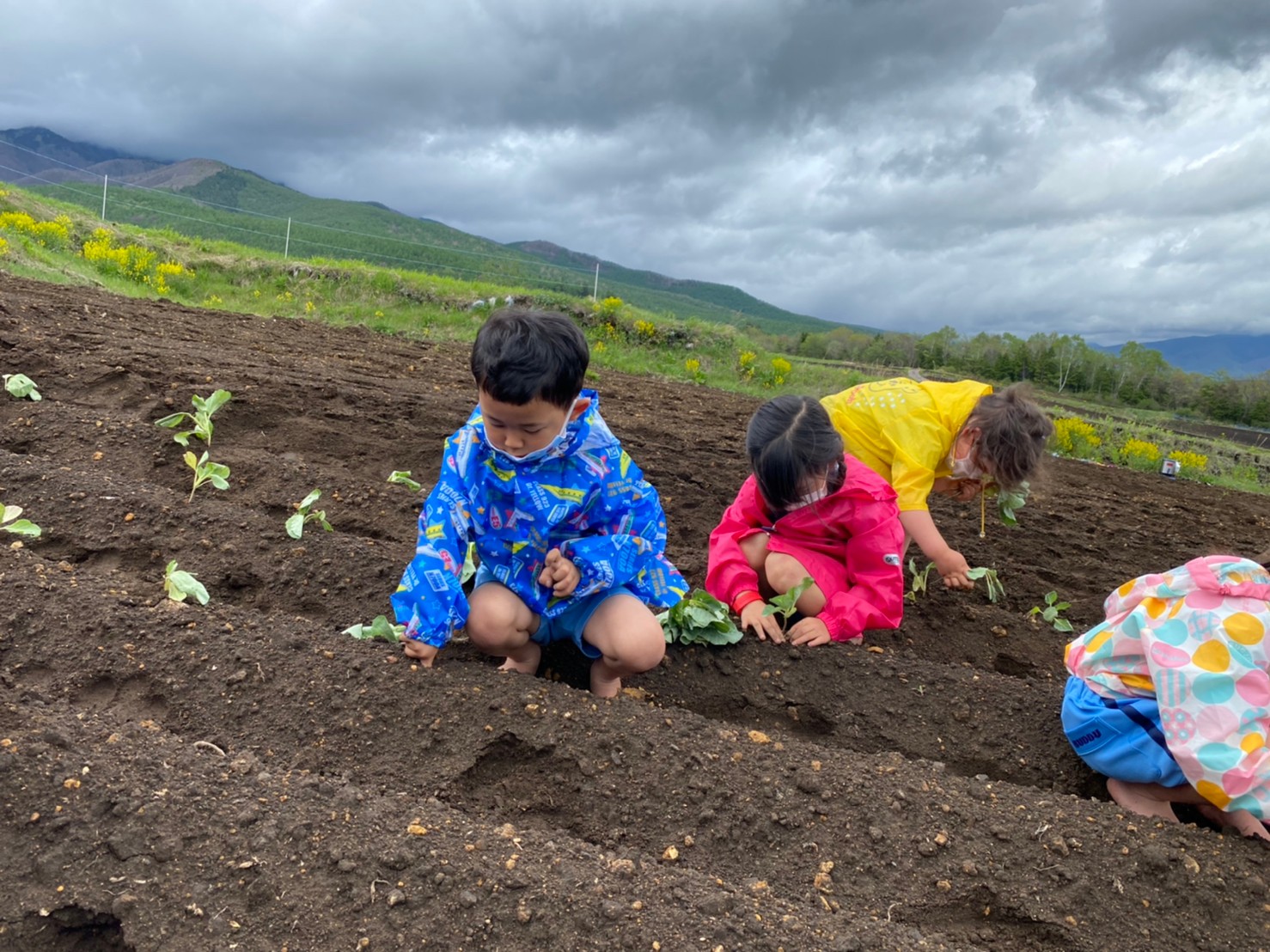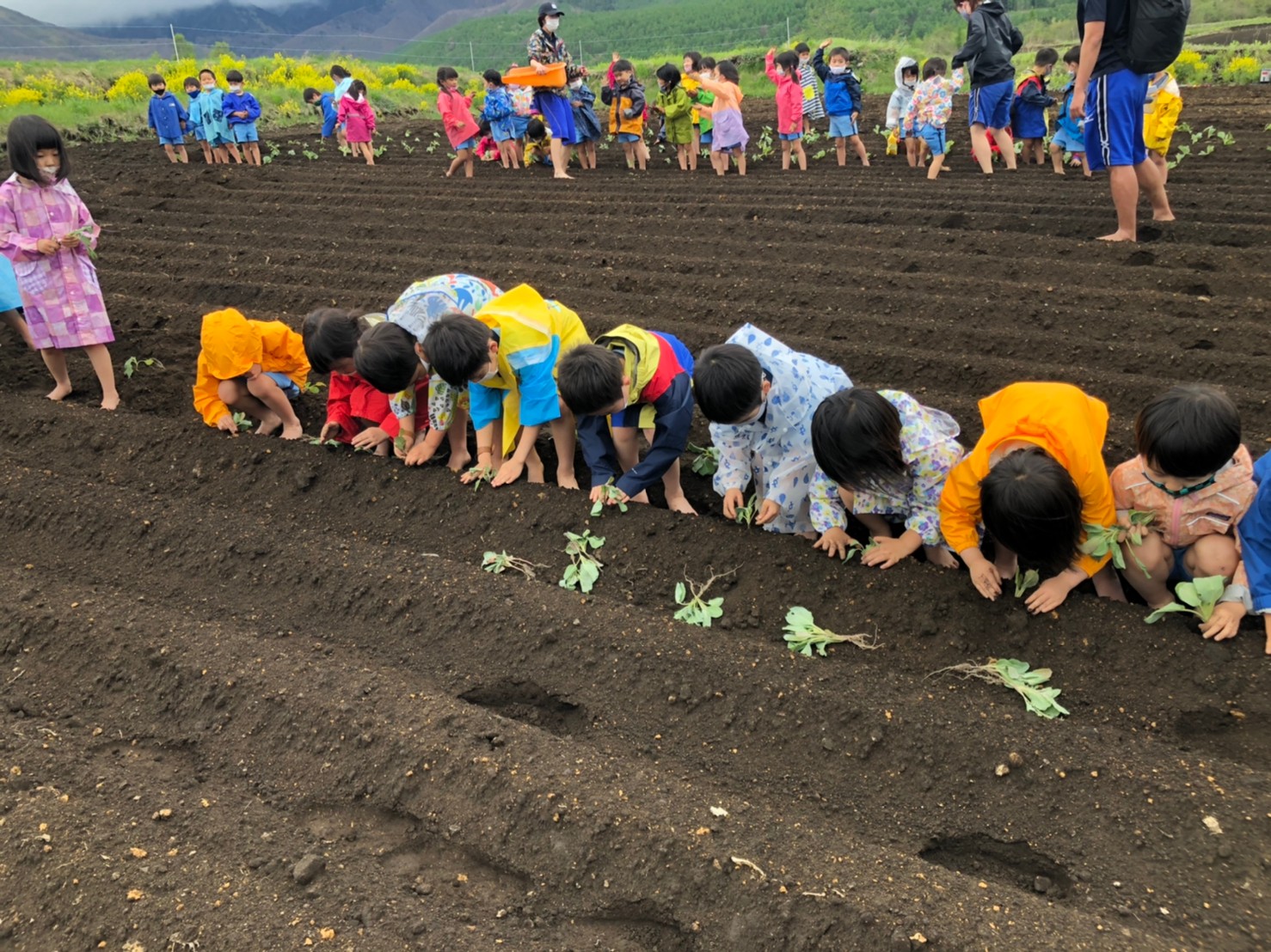初日は雨が心配されましたが、雨に降られることも無く無事にキャベツの苗を植えることができました。