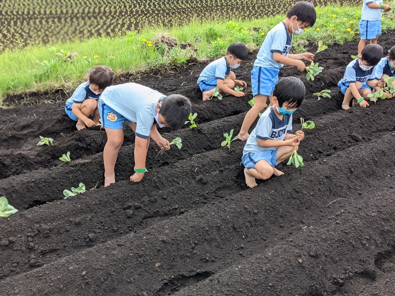 子どもたちにとって始めてのキャベツの苗植えは、苗が中々まっすぐたたず苦戦している子もいましたが、練習したキャベツの歌を思い出しながら持っている苗を全て植えることができていました。